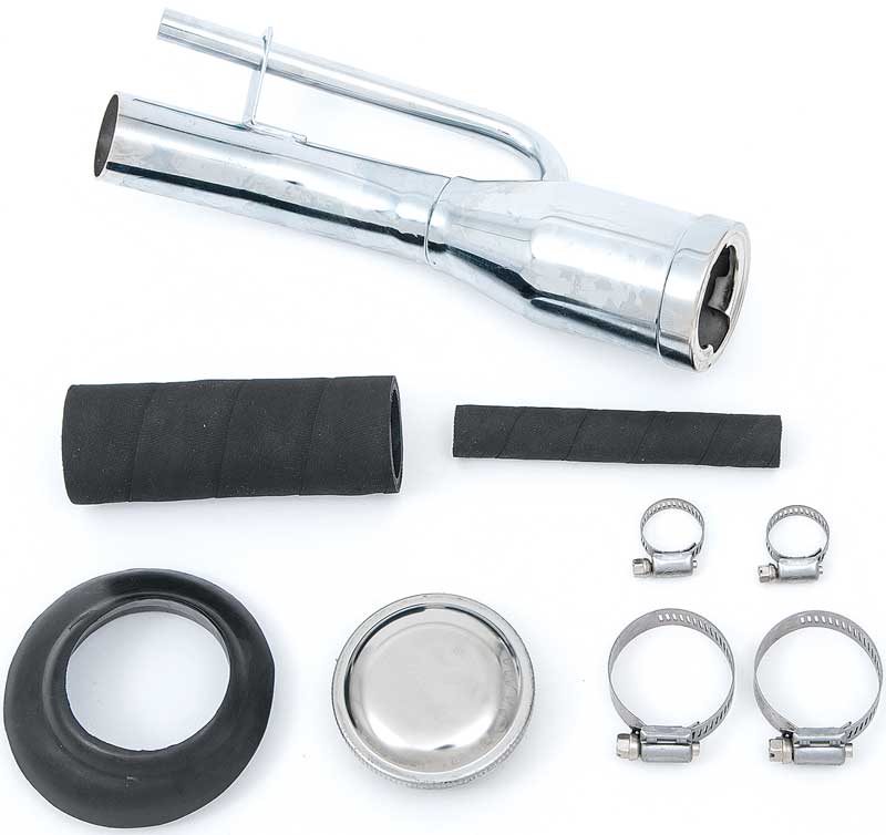 This is a must when installing a new fuel tank into your 1947-55 1st Series Chevrolet and GMC truck. Sets include a chrome fuel filler neck, filler neck to cab rubber grommet, fuel tank to filler neck hose, vent hose and a polished stainless steel fuel cap. These sets feature all new reproduction items including hose clamps. This is a complete fuel tank installation kit.