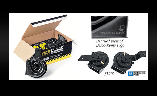 Quality reproduction horns for 1961-69 full size Chevrolet passenger cars including Impala, Bel Air, Biscayne and Caprice models. These quality reproduction horns feature the correct "swirl" shaped housings with "Delco-Remy" markings in the original font. Each horn assembly features the correct semi-gloss black finish and includes pre-installed riveted mounting brackets in the factory original configuration for easy installation. Each pair of horns includes a high and low note horn pre-packaged in a specially constructed box offering superb protection against damage during storage or transit. Officially licensed by General Motors.