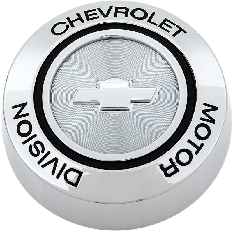 Correct reproduction hub cap ornament installed on various Chevrolet model wheels without disc brakes. Mounting screws are included. Reads "Chevrolet Motor Division"