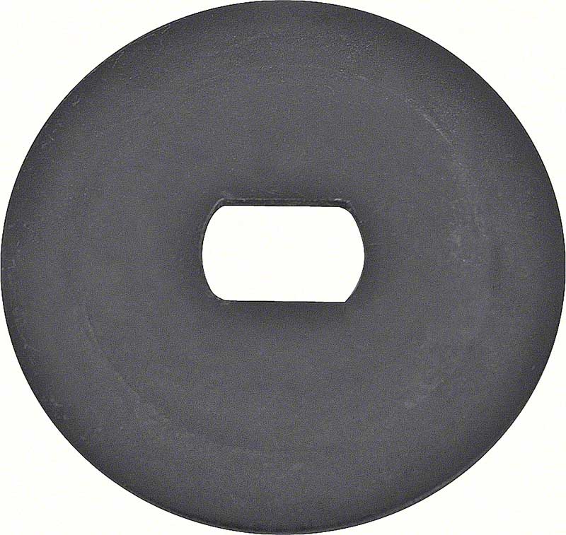 Reproduction of the window roller guide washer. Manufactured from stamped steel with a black oxide finish and slotted hole as original, this washer interlocks with the roller guide shaft at the glass.