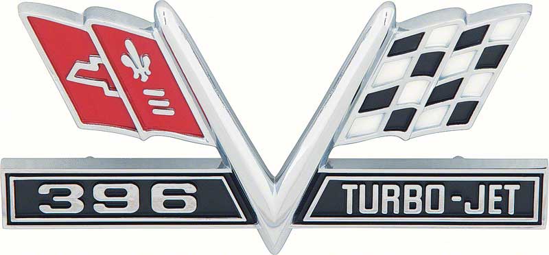 This emblem is one piece and features the "396" and "TURBO-JET" lettering with a satin black background as well as the red background LH flag and the black and white checkered victory flag on the RH side.