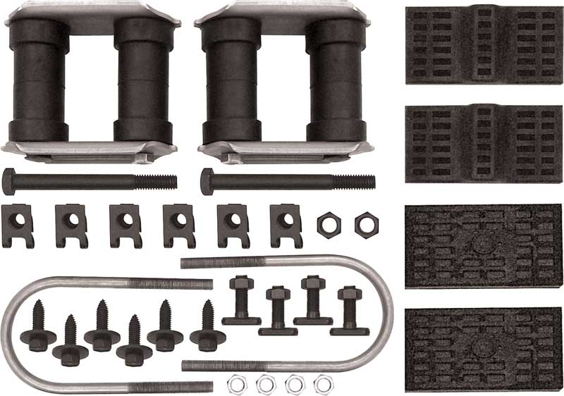 - Includes rear shackles, U-bolts, upper and lower spring pads, spring eye bolts, clips, and mounting screws.
