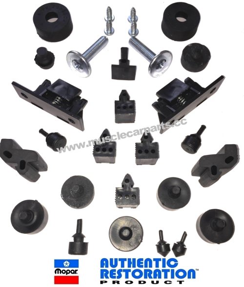 Our body bumper kit is the most superior on the market. Our kits are Mopar Authentic Restoration Products. 100% made in America (unlike others with cheap made in China plastic hood wedges). Our kits also includes the previous mentioned wedges and mounting screws. We also include the hood bumper bolts (large bolts shown in the photo). Our kit includes Pentastars, part numbers, manufacturer stamps and more- just like originals. Some pieces originally had Pentastars molded into them, and to be correct, our kits also include the Pentastars molded into the same pieces that originally had Pentastars.