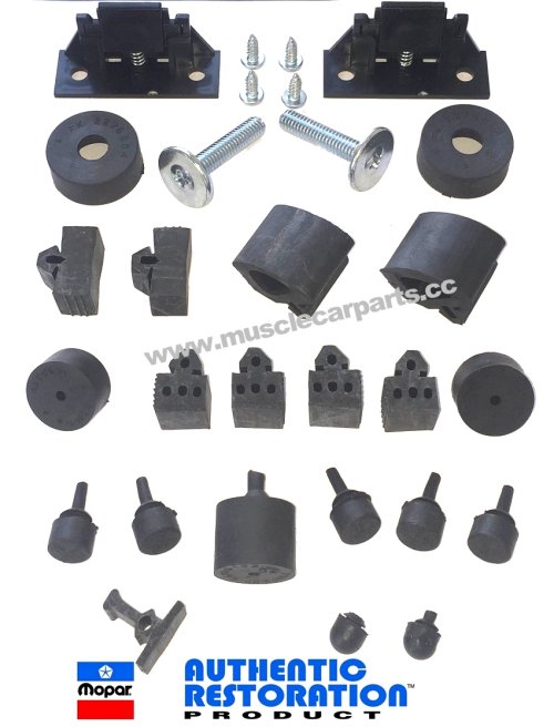 Our body bumper kit is the most superior on the market. Our kits are Mopar Authentic Restoration Products. 100% made in America (unlike others with cheap made in China plastic hood wedges). Our kits also includes the previous mentioned wedges and mounting screws. We also include the hood bumper bolts (large bolts shown in the photo). Our kit includes Pentastars, part numbers, manufacturer stamps and more- just like originals. Some pieces originally had Pentastars molded into them, and to be correct, our kits also include the Pentastars molded into the same pieces that originally had Pentastars.