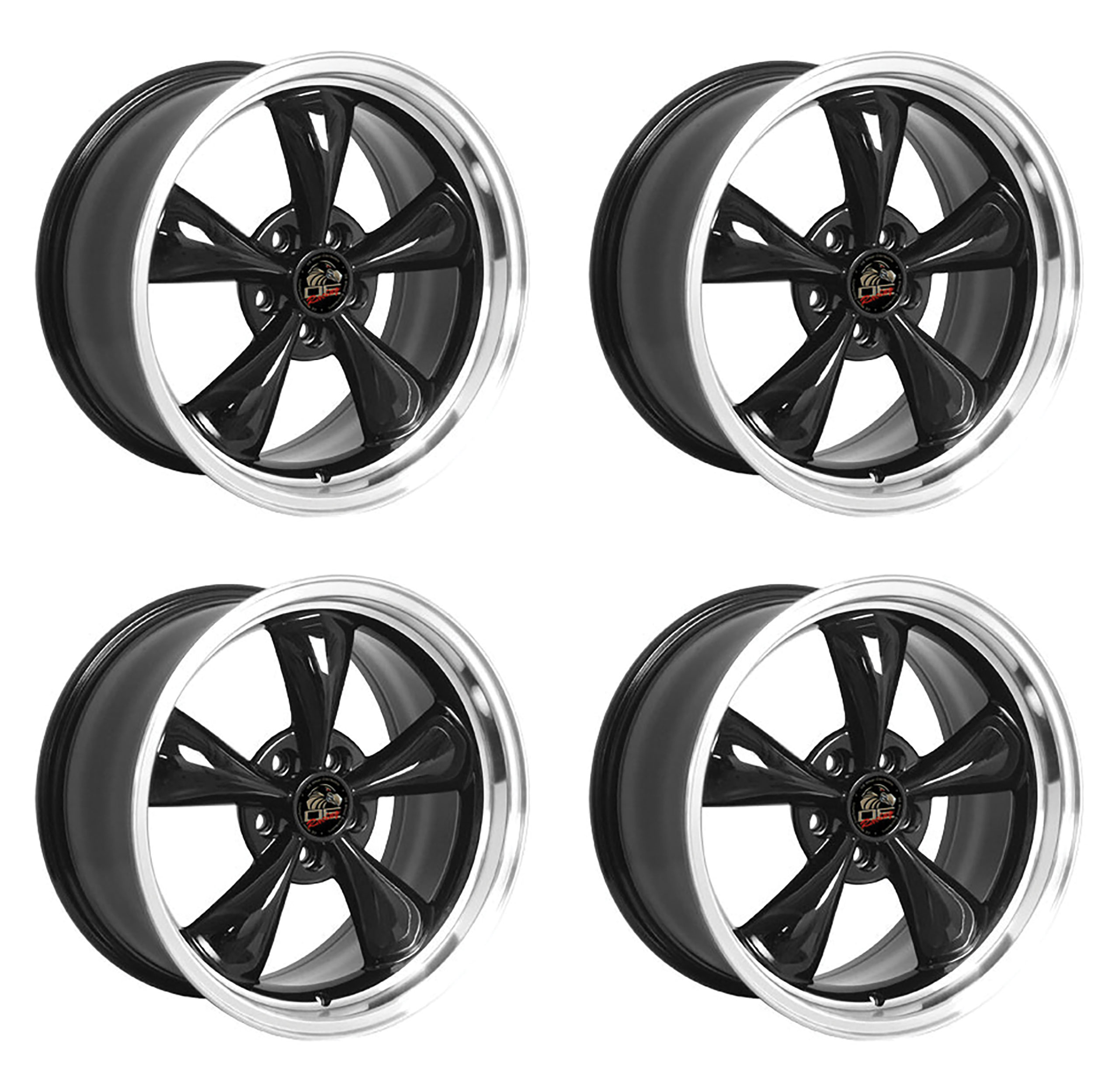 1979-2004 Ford Mustang Wheel Set, 18" Bullitt Style, 5 Lug, Gloss Black Machine Lip 9"